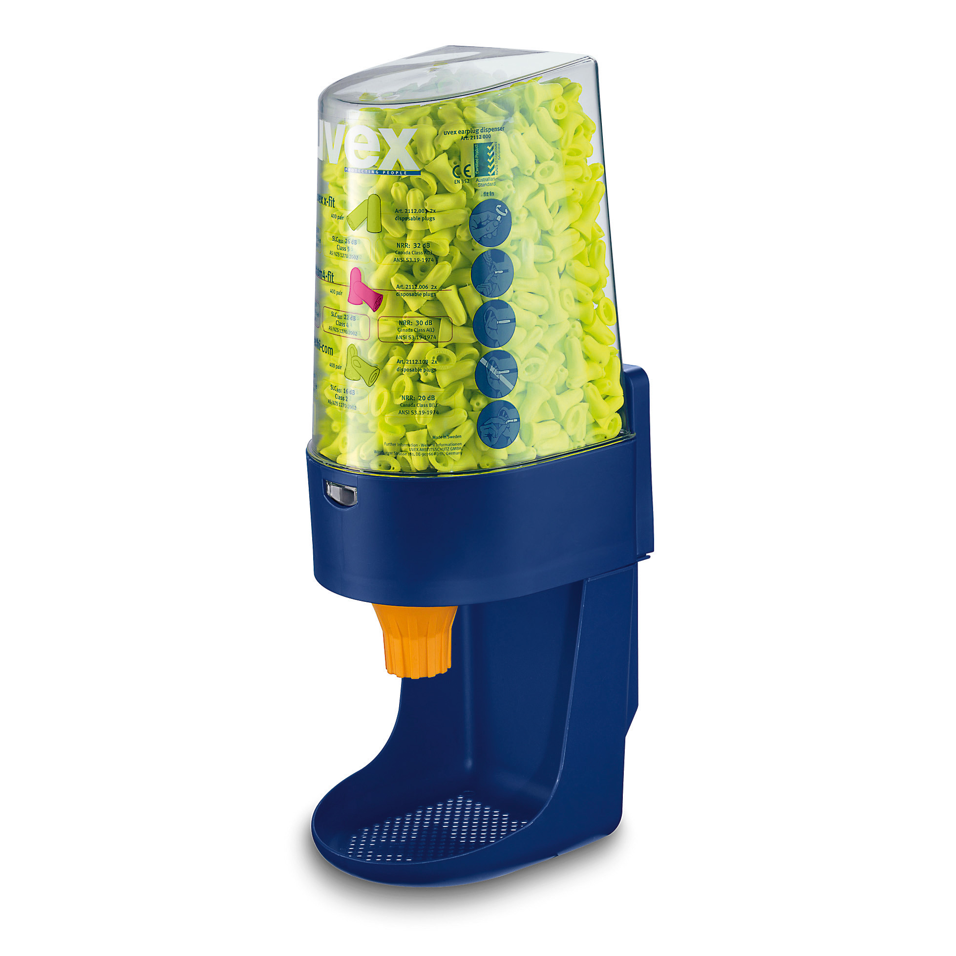 UVEX ONE 2 CLICK dispenser (2112000) for earplugs X-FIT or HI-COM, Construction: bottle is made of transparent plastic for easy view of the number of earplugs in the dispenser. Multi-use dispenser ensures convenient hygienic storage of earplugs. Installed in a workshop or other production premises, it has sufficient capacity to supply large production areas with hearing protection. Can be wall-mounted or placed on a desktop.